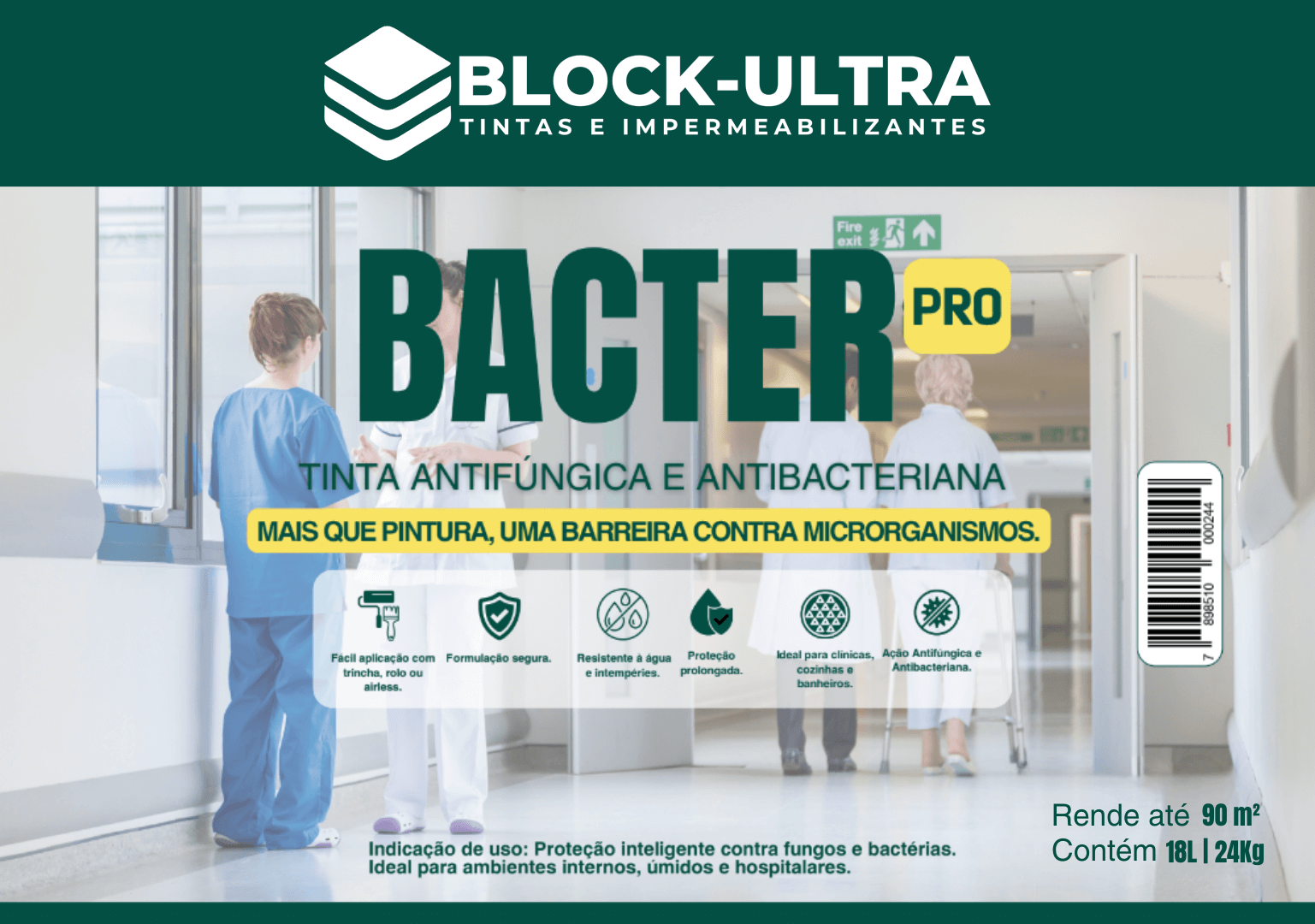 Impermeabilizante de última geração com proteção estrutural e ação bactericida, fungicida e antimofo avançada para ambientes hospitalares e alimentícios.