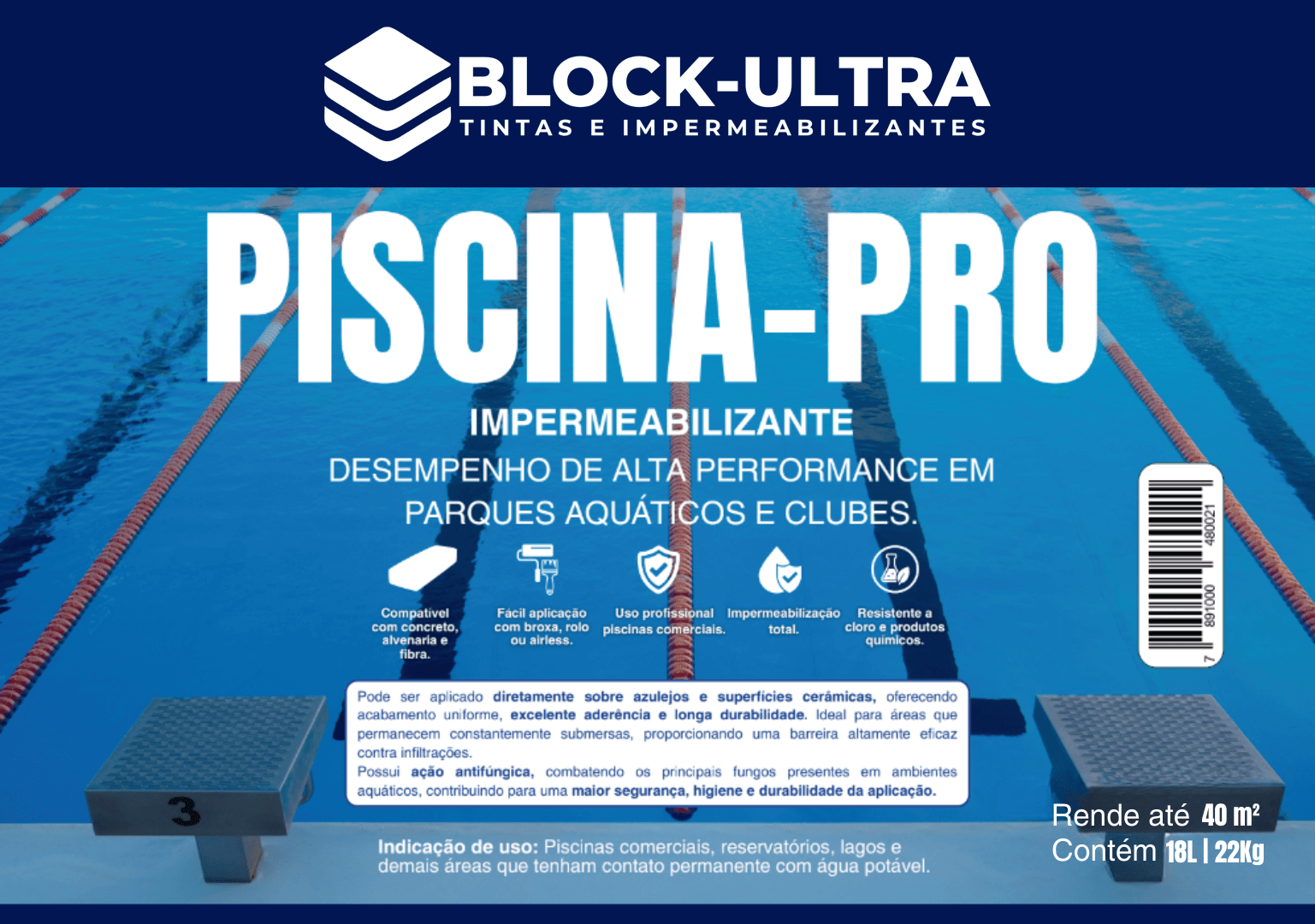 Impermeabilizante técnico de alta performance para piscinas comerciais, clubes e reservatórios. Forma película contínua rígida e estanque.